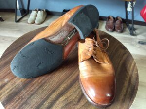 渋いですね。そしてヴィンテージ感に溢れてますね。エイジングの進んだアッパーのですがキズやシミがほとんどなく、ディスプレイ用にに欲しいものです。 持ち込まれたのはご婦人で、ヒールを高くして滑らない様に裏にラバーを張って欲し […]